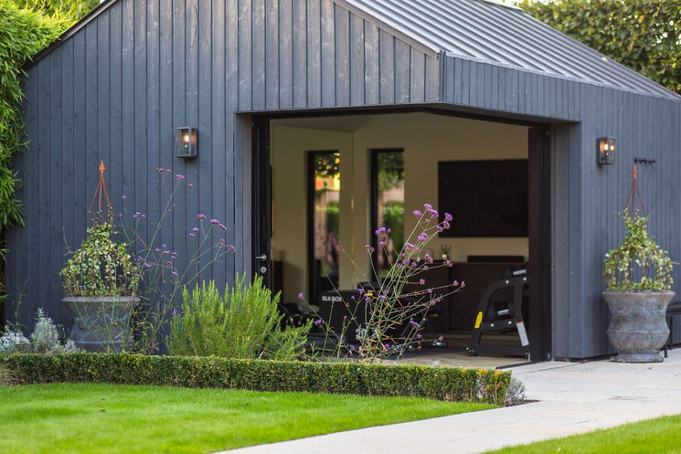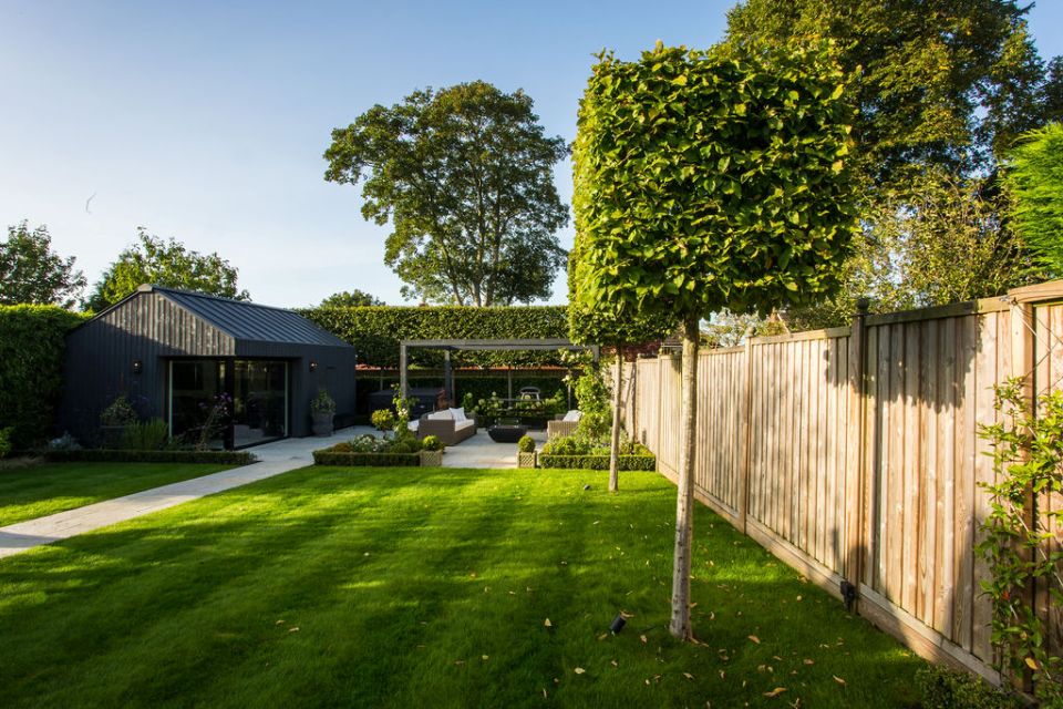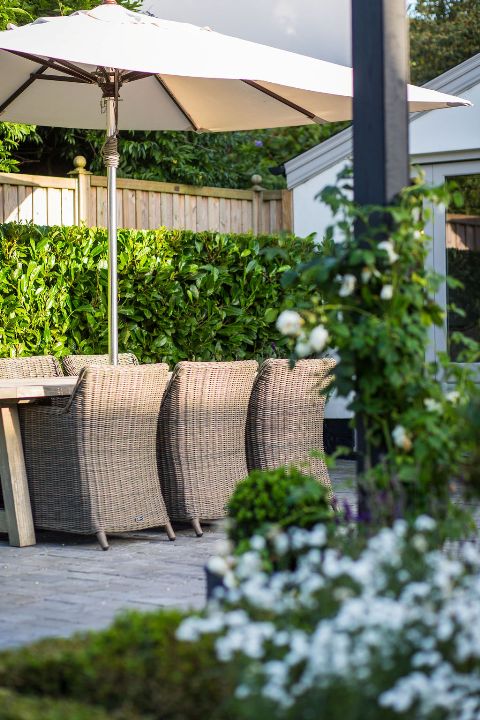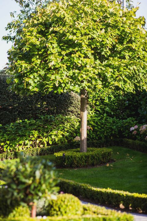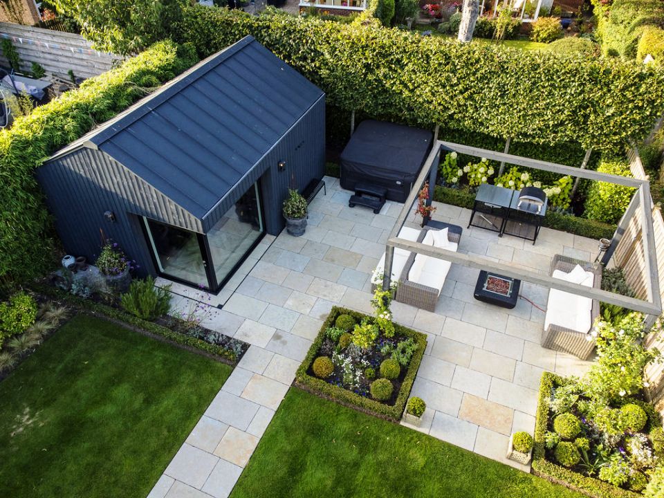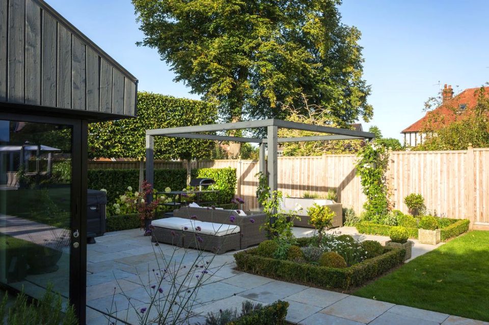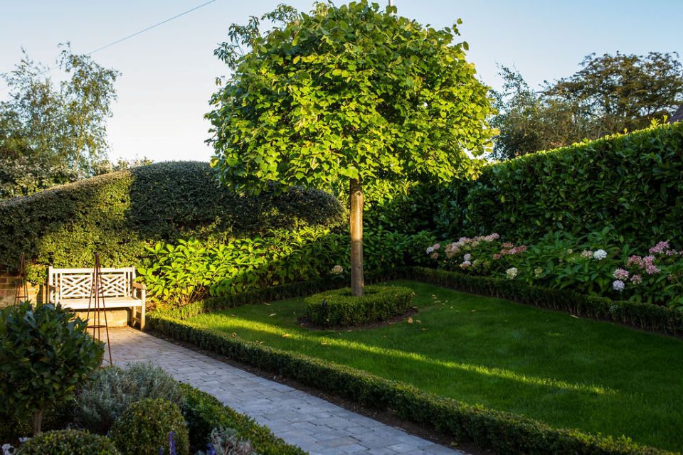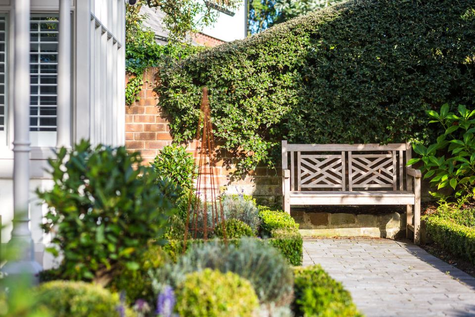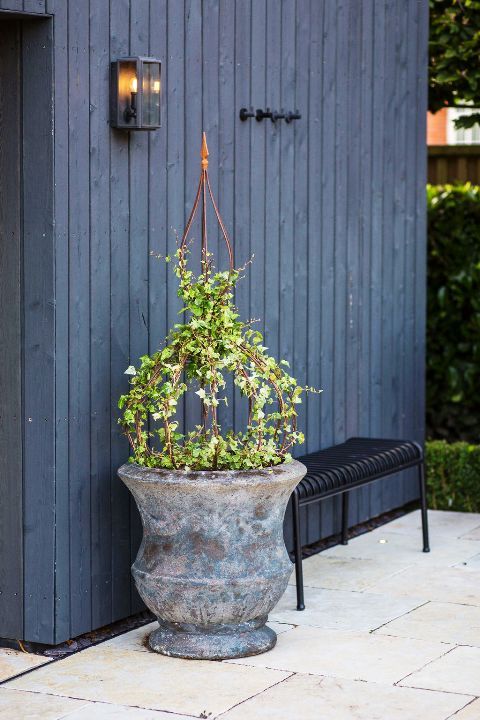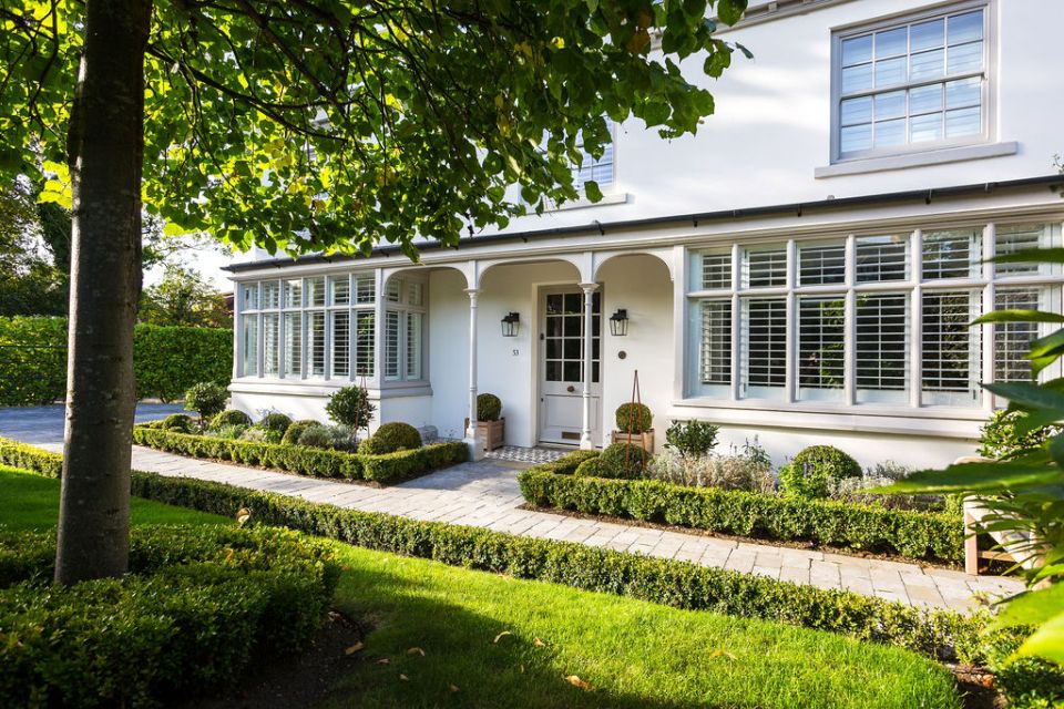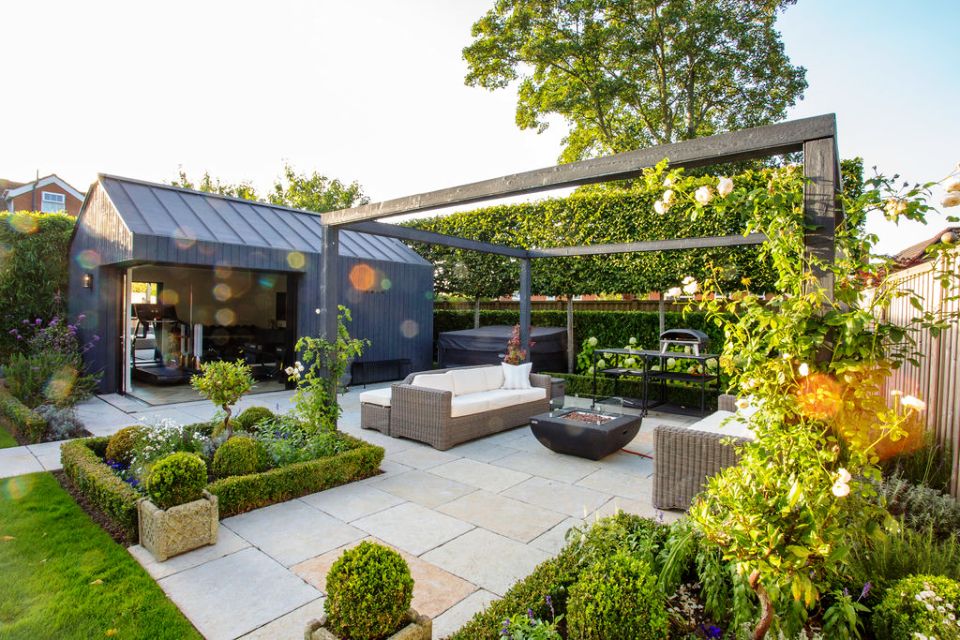 A modern country garden for a beautiful period property in Lymm, Cheshire. My clients had already created the bones of the garden, and I was asked to further develop and enhance with hard landscaping, structures and planting. Two pergolas add vertical interest and support for climbing roses and a timber clad summerhouse acts as a gym. Tumbled limestone paving is used through the garden to complement the stone inside the house and contemporary cottage garden plants such as Agapanthus, white Hydrangeas, Salvias and Verbenas are teamed with topiary and clipped forms to give a modern twist to the classic style. Zinc box lanterns are featured on key walls and statement planters with bespoke wire frames, topiary and a character Olive tree soften the house and structures. A huge dome clipped tree adds impact to the front, alongside masses of white hydrangeas and enhanced planting. Photography by Tom Biddle https://www.arc.tombiddle.co.uk/